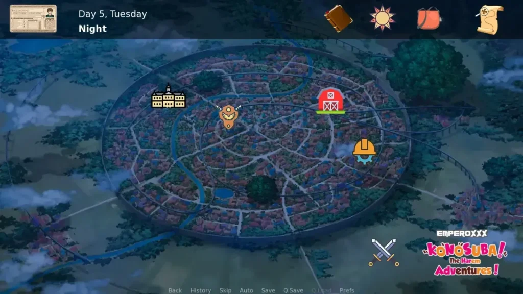 - The Trainer Mechanics: At its heart, this is a brilliant Kazuma trainer game. You guide Kazuma as he manages his party of adventurer girls. This involves training their stats (combat, magic, charm), sending them on jobs to earn eris, and managing their equipment. It’s incredibly satisfying to see your efforts pay off as Aqua finally lands a hit or Megumin learns a new (slightly less destructive) spell.